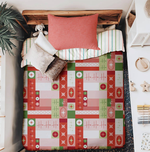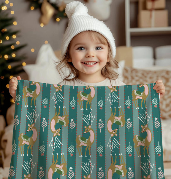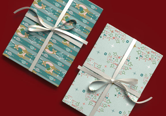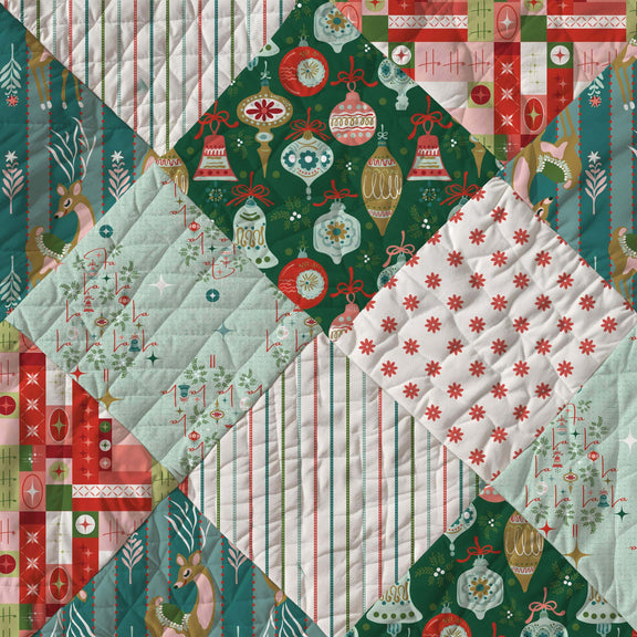 Bursting with vintage cheer and playful charm, the Fa La La collection brings a fresh twist to classic holiday nostalgia. With mid-century ornaments, stylized reindeer, cheerful stripes, and cozy textures, this collection sings with retro spirit in a palette of mint, blush, gold, and holly red.