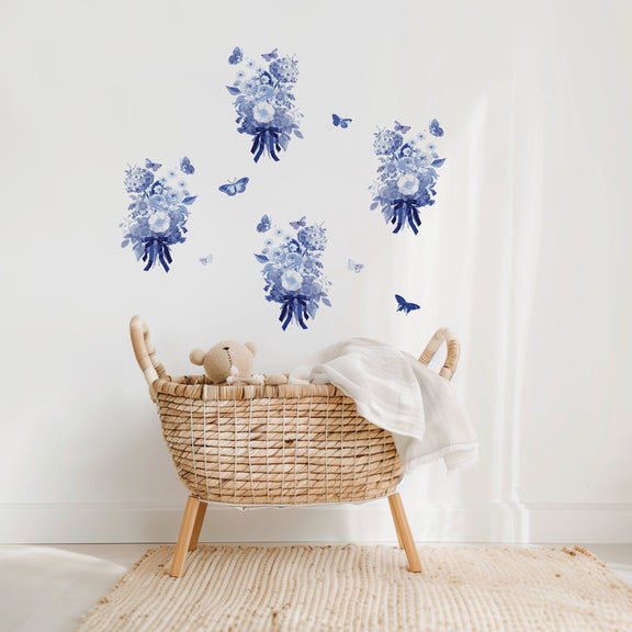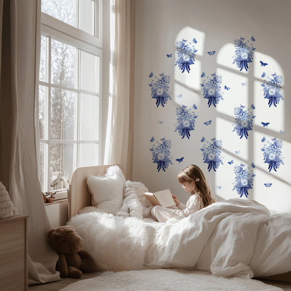 “Flutterbloom” is a graceful arrangement of blue florals and fluttering butterflies, designed as removable wall decals or as a downloadable PDF for printable art. A romantic nod to vintage elegance, perfect for serene interiors.