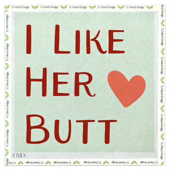 Sweet, sassy, and totally stitch-worthy—this “I Like Her Butt” needlepoint canvas is a cheeky way to say I’m smitten. With bold red lettering, a heart to match, and a soft minty green background, this flirty design is perfect for adding a little humor (and love!) to your home.