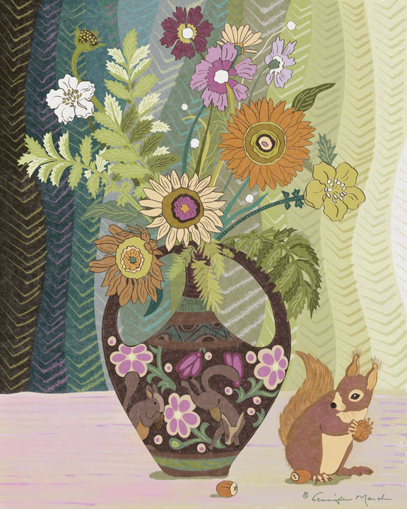 Brimming with woodland charm and folk art flair, The Collector is a richly detailed print that tells a cozy story in a single frame. The palette—earthy, nostalgic, and gently playful—makes this piece perfect for fall decorating, forest-themed interiors, or anyone who appreciates nature with a bit of storytelling magic. This artwork invites you to slow down and take in the details: the embroidery-like patterns, the folk-art motifs, and the gentle balance of whimsy and refinement.